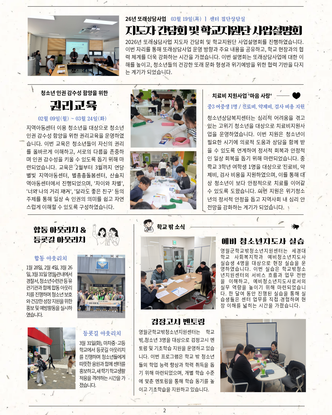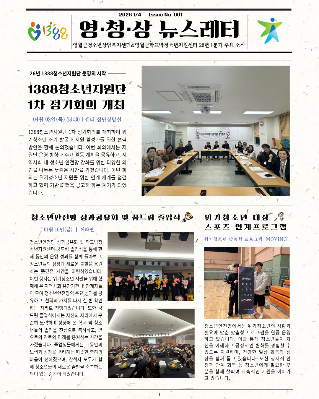 [영·청·상 뉴스레터] 2026년 1분기 소식지 페이지 정보 작성자 영청상 댓글 0건 조회 31회 작성일 26-04-08 09:15 본문 영월군청소년상담복지센터·영월군학교밖청소년지원센터 2026년도 1분기 소식지입니다. 목록 다음글[참가자 모집] 고위기청소년 스포츠 연계 프로그램 25.07.22 댓글목록 댓글목록 등록된 댓글이 없습니다.